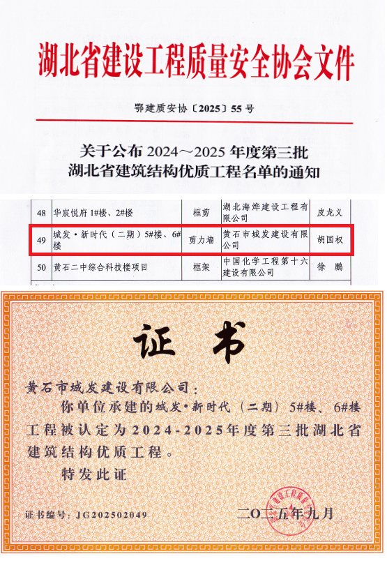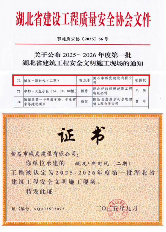 近日,黃石市城發(fā)建設(shè)有限公司承建的城發(fā)·新時(shí)代(二期)項(xiàng)目喜獲殊榮,被認(rèn)定為2024至2025年度第三批湖北省建筑結(jié)構(gòu)優(yōu)質(zhì)工程和2025-2026年度第一批湖北省建筑工程安全文明施工現(xiàn)場(chǎng)。這一成就不僅彰顯了項(xiàng)目部的卓越管理能力,更標(biāo)志著城發(fā)建工集團(tuán)在打造高品質(zhì)人居標(biāo)桿的道路上邁出了堅(jiān)實(shí)一步。
